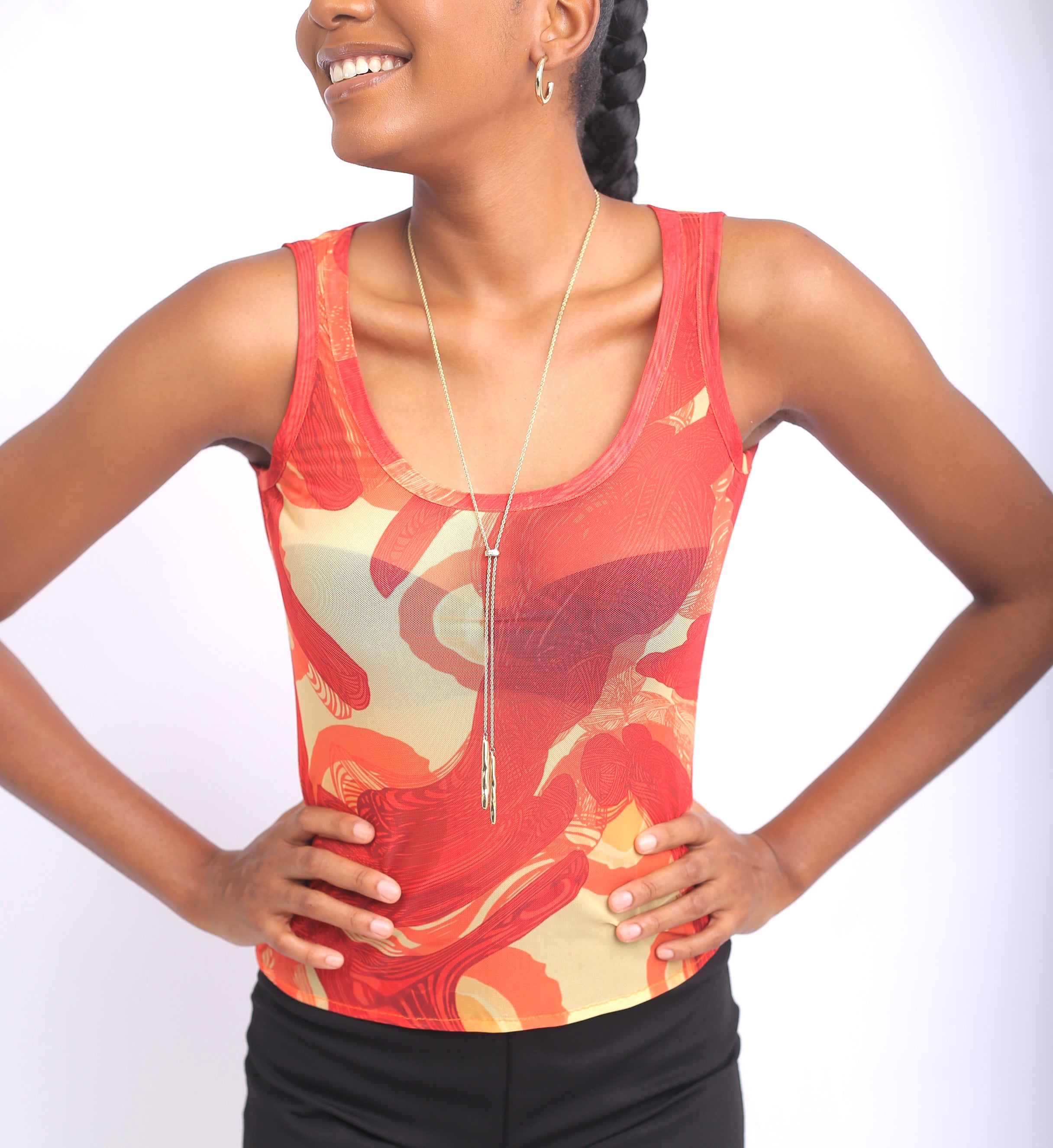 Imole Tank Top isn’t your average tank. Made from soft stretch breathable mesh fabric, this sleeveless essential adds a bold yet effortless finish to any summer look. Designed to hug your frame with just the right amount of give, it pairs perfectly with shorts, denim, or under a blazer for a sheer-chic contrast.